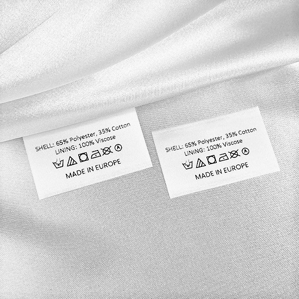 Metka tekstylna z oznaczeniami prania i pielęgnacji, informacjami o składzie materiału, dostosowywana na delikatnej satynie wysokiej jakości, ultradźwiękowo. Ten typ metki tekstylnej jest wytwarzany przy użyciu najbardziej zaawansowanych technologii w dziedzinie druku cyfrowego na podkładzie tekstylnym. Etykiety są drukowane na specjalnej satynie metodą termotransferową , o imponującej jakości druku i wysokiej odporności na pranie.