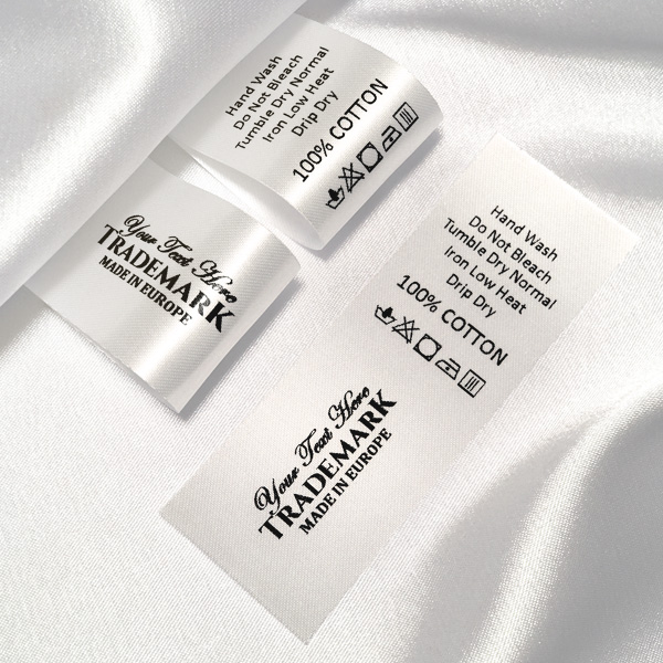 Metka dotycząca sposobu prania, pasująca do ubrań i rozmaitych wyrobów włókienniczych, s szczególności do odzieży, z logo, drukowana na delikatnej białej satynie. Ten typ metki tekstylnej jest wytwarzany przy użyciu najbardziej zaawansowanych technologii w dziedzinie druku cyfrowego na podkładzie tekstylnym. Etykiety są drukowane na specjalnej satynie metodą termotransferową , o imponującej jakości druku i wysokiej odporności na pranie.