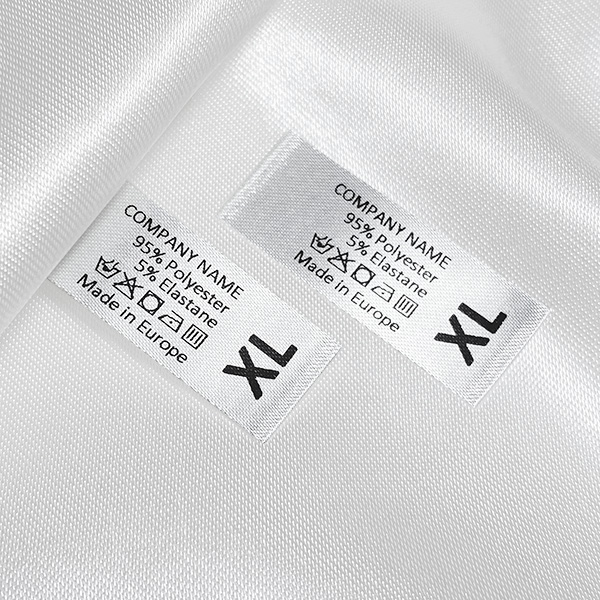 Metka pielęgnacyjna z rozmiarami i symbolami prania wykonana z wysokiej jakości satyny, do naszycia na odzież. Ten typ metki tekstylnej jest wytwarzany przy użyciu najbardziej zaawansowanych technologii w dziedzinie druku cyfrowego na podkładzie tekstylnym. Etykiety są drukowane na specjalnej satynie metodą termotransferową , o imponującej jakości druku i wysokiej odporności na pranie.