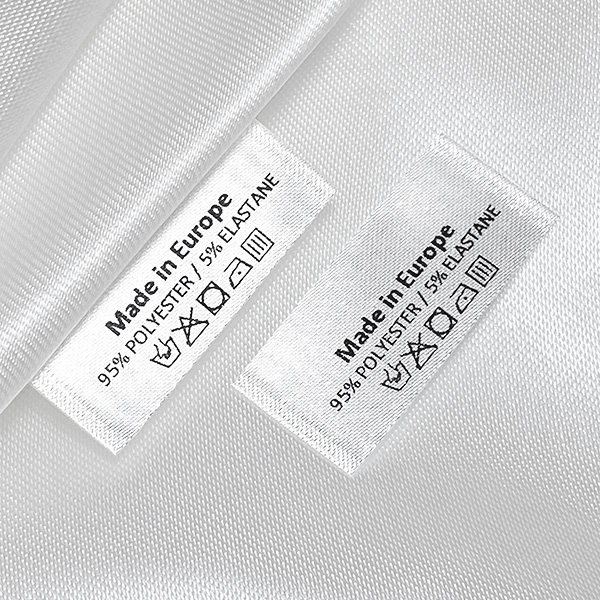Personalizowana metka satynowa z symbolami prania i pielęgnacji materiału tekstylnego, z którego wykonany jest dany artykuł odzieżowy, do naszycia na odzież. Ten typ metki tekstylnej jest wytwarzany przy użyciu najbardziej zaawansowanych technologii w dziedzinie druku cyfrowego na podkładzie tekstylnym. Etykiety są drukowane na specjalnej satynie metodą termotransferową , o imponującej jakości druku i wysokiej odporności na pranie.