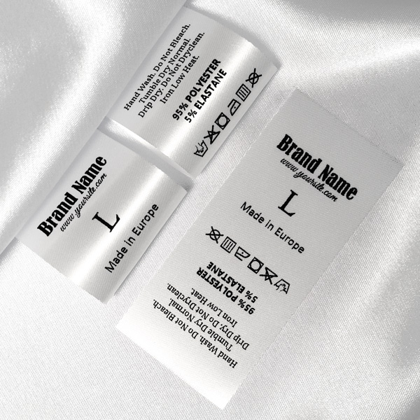 Satynowa metka dotycząca sposobu prania, zawierająca informacje o rozmiarze, tekst, oznaczenia prania i instrukcje dotyczące prania, a także nazwę marki, pasująca do ubrań. Ten typ metki tekstylnej jest wytwarzany przy użyciu najbardziej zaawansowanych technologii w dziedzinie druku cyfrowego na podkładzie tekstylnym. Etykiety są drukowane na specjalnej satynie metodą termotransferową , o imponującej jakości druku i wysokiej odporności na pranie.