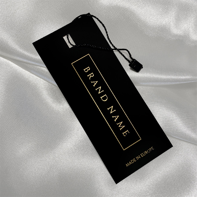 Tekturowa przywieszka ze złotym napisem i czarnym tłem, zaopatrzona w sznurek do odzieży, wykonana z grubej laminowanej Soft Touch na obu stronach tektury. Ten typ zawieszanej metki jest wykonywany z wysokiej jakości materiałów, przy użyciu najbardziej zaawansowanych technologii w dziedzinie druku cyfrowego i wykończenia.