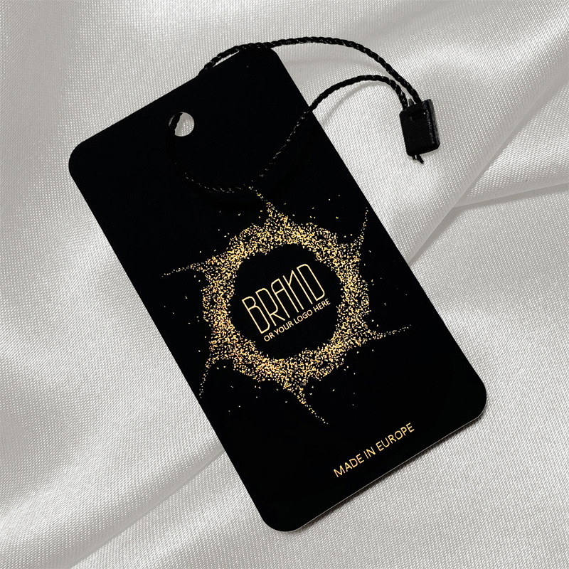 Przywieszka kartonowa do ubrań model HT-M95 zaopatrzona w plombę i poliestrowy sznurek do przywieszenia do ubrań, dostosowana złotym napisem na laminowanej czarną folią tekturze. Ten typ zawieszanej metki jest wykonywany z wysokiej jakości materiałów, przy użyciu najbardziej zaawansowanych technologii w dziedzinie druku cyfrowego i wykończenia.