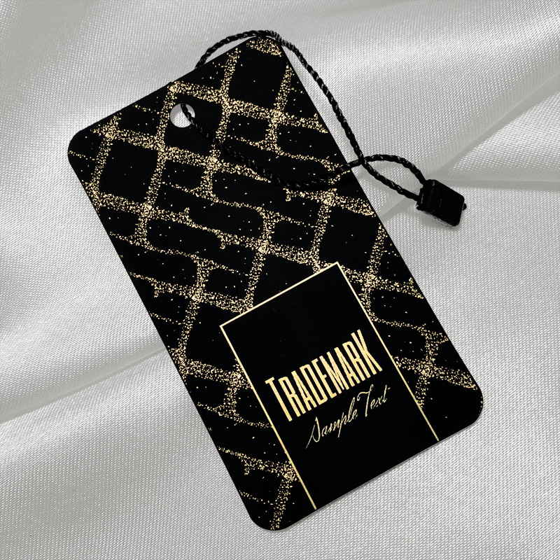 Metka ze złotym napisem wykonana z laminowanej tektury ze specjalną folią z aksamitną teksturą, pasująca do ubrań, akcesoriów odzieżowych, butów i innych. Ten typ zawieszanej metki jest wykonywany z wysokiej jakości materiałów, przy użyciu najbardziej zaawansowanych technologii w dziedzinie druku cyfrowego i wykończenia.