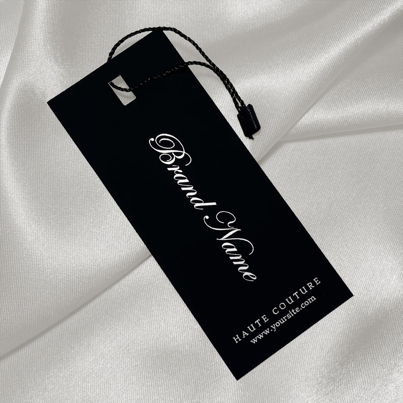 Tekturowa metka z plastikową plombą pasująca do ubrań i akcesoriów odzieżowych, wykonana z grubej czarnej tektury laminowanej folią Soft Touch i personalizowana srebrnym napisem typu Folio Hot Stamp. Ten typ zawieszanej metki jest wykonywany z wysokiej jakości materiałów, przy użyciu najbardziej zaawansowanych technologii w dziedzinie druku cyfrowego i wykończenia.