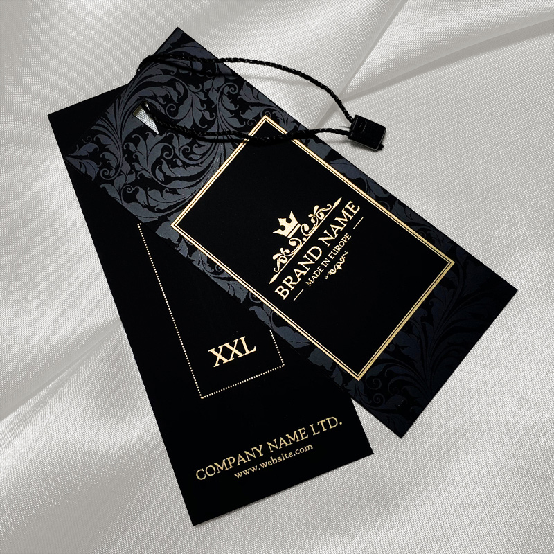Metki odzieżowe z projektem Premium i plombą z zawartym czarnym sznurkiem, zrobione z laminowanej tektury Soft Touch i z personalizowanym napisem ze złotej folii. Ten typ zawieszanej metki jest wykonywany z wysokiej jakości materiałów, przy użyciu najbardziej zaawansowanych technologii w dziedzinie druku cyfrowego i wykończenia.