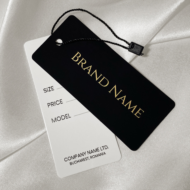 Zestaw 2 tekturowych metek zaopatrzonych w plombę z wiszącym sznurkiem do ubrań lub akcesoriów odzieżowych, wykonane z cienkiej uplastycznionej tektury i drukowane ze złotym i czarnym tekstem. Ten typ zawieszanej metki jest wykonywany z wysokiej jakości materiałów, przy użyciu najbardziej zaawansowanych technologii w dziedzinie druku cyfrowego i wykończenia.
