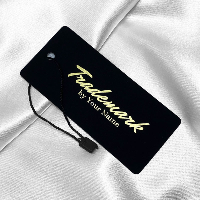 Metka do zawieszania na ubraniach typu Tag, wykonywana na zamówienie z czarnego kartonu z tekstem lub personalizowanym logo nadrukowanym termotransferem z Golden Folio. Ten typ zawieszanej metki jest wykonywany z wysokiej jakości materiałów, przy użyciu najbardziej zaawansowanych technologii w dziedzinie druku cyfrowego i wykończenia.