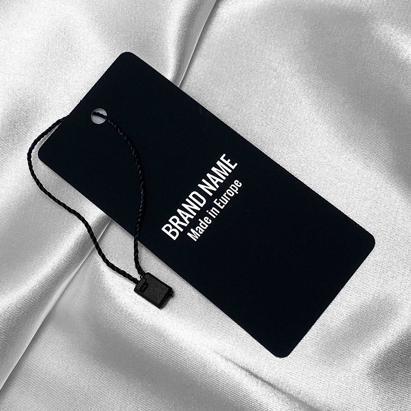 Elegancka metka na ubrania z zawieszanym sznurkiem, wykonana z czarnego kartonu, personalizowana srebrnym napisem lub logo. Ten typ zawieszanej metki jest wykonywany z wysokiej jakości materiałów, przy użyciu najbardziej zaawansowanych technologii w dziedzinie druku cyfrowego i wykończenia.
