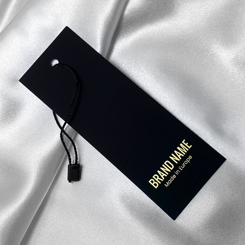 Etykieta na odzież lub dodatki odzieżowe, wykonywana na zamówienie z czarnego kartonu Soft Touch, personalizowana srebrną folią z nazwą marki lub logo. Ten typ zawieszanej metki jest wykonywany z wysokiej jakości materiałów, przy użyciu najbardziej zaawansowanych technologii w dziedzinie druku cyfrowego i wykończenia.