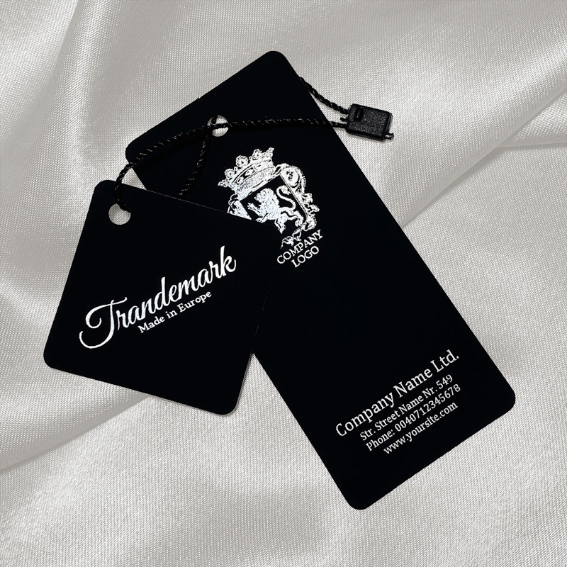 Zestaw składający się z 2 przepięknych tekturowych metek zawierających plomby ze sznurkami do ubrań, wykonane z czarnej laminowanej Soft Touch tektury i personalizowane srebrnym folio rodzaju Digital Hot Stamp. Ten typ zawieszanej metki jest wykonywany z wysokiej jakości materiałów, przy użyciu najbardziej zaawansowanych technologii w dziedzinie druku cyfrowego i wykończenia.