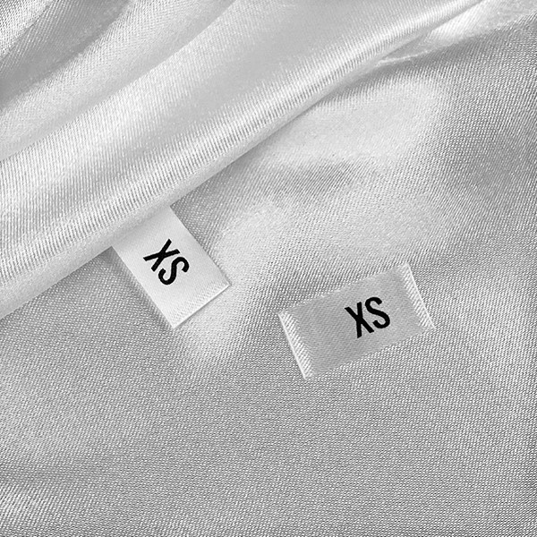Metki tekstylne z rozmiarem lub numerem produktu, do którego będą przyszyte, wykonane z białej satyny drukowanej z czarnym napisem. Ten typ metki tekstylnej jest wytwarzany przy użyciu najbardziej zaawansowanych technologii w dziedzinie druku cyfrowego na podkładzie tekstylnym. Etykiety są drukowane na specjalnej satynie metodą termotransferową, o imponującej jakości druku i wysokiej odporności na pranie.