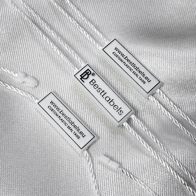 Plastikowa plomba ST-M154 o prostym prostokątnym kształcie, z indywidualnym tekstem, nazwą marki, znakiem, stroną internetową itp. oraz logo / emblematem, odpowiednia dla każdego rodzaju produktu z branży tekstylnej, odzieży, obuwia, toreb. Ten typ plomby jest wykonywany z wysokiej jakości materiałów, przy użyciu najbardziej zaawansowanych technologii w tej dziedzinie.