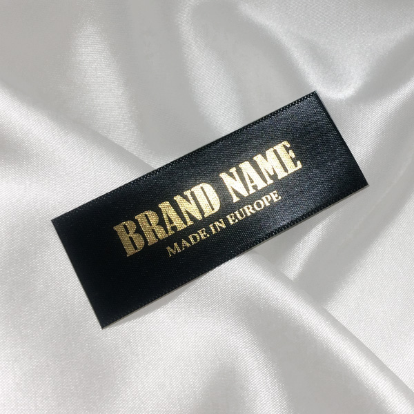 Wszywka drukowana z nazwą Marki ze złotym napisem na cienkiej czarnej satynie, pasująca do ubrań. Ten typ metki tekstylnej jest wytwarzany przy użyciu najbardziej zaawansowanych technologii w dziedzinie druku cyfrowego na podkładzie tekstylnym. Etykiety są drukowane na specjalnej satynie metodą termotransferową, o imponującej jakości druku i wysokiej odporności na pranie.