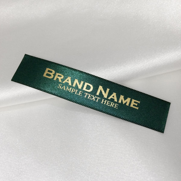Metka tekstylna drukowana z dostosowanymi tekstami na satynie, wycinana zgodnie z prezentowanymi wymiarami.
