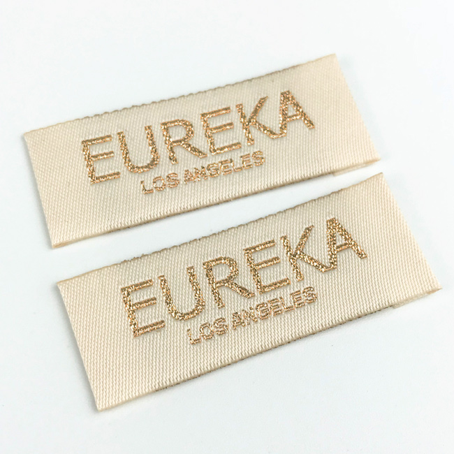 Metka odzieżowa wykonana z adamaszku, tkana nićmi do haftowania lub lureksowymi nitkami model WL-M10, personalizowane z nazwą Marki lub logo. Ten typ metki tkanej jest wykonywany z wysokiej jakości materiałów, przy użyciu najbardziej zaawansowanych technologii w dziedzinie haftu cyfrowego na poziomie przemysłowym.