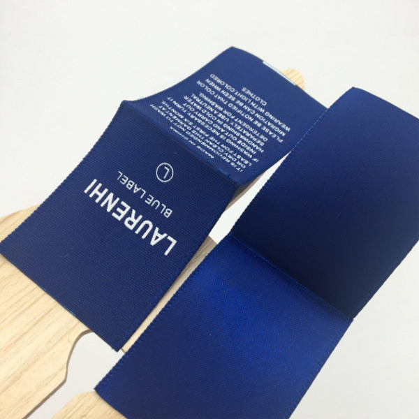 Metka tekstylna zgięta w połowie, dostosowywana z haftowanymi Digital High Density napisami.