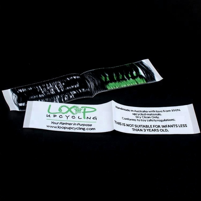 Wszywka tkana zgięta w połowie, dostosowywana z Digital High Density haftowanymi napisami.